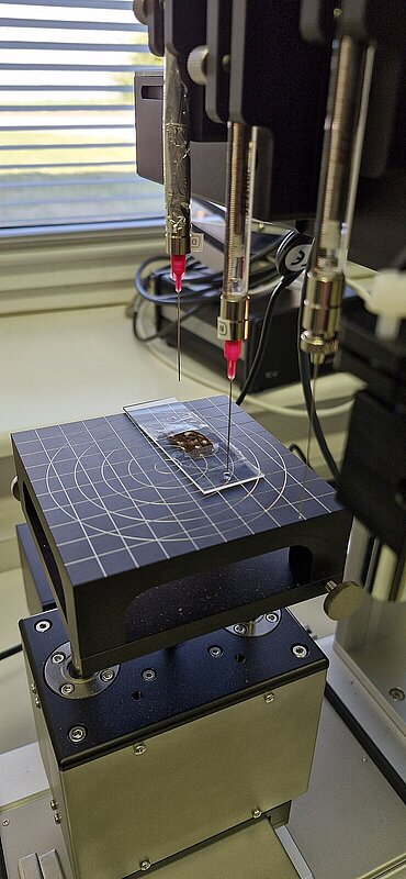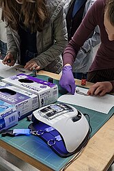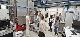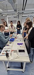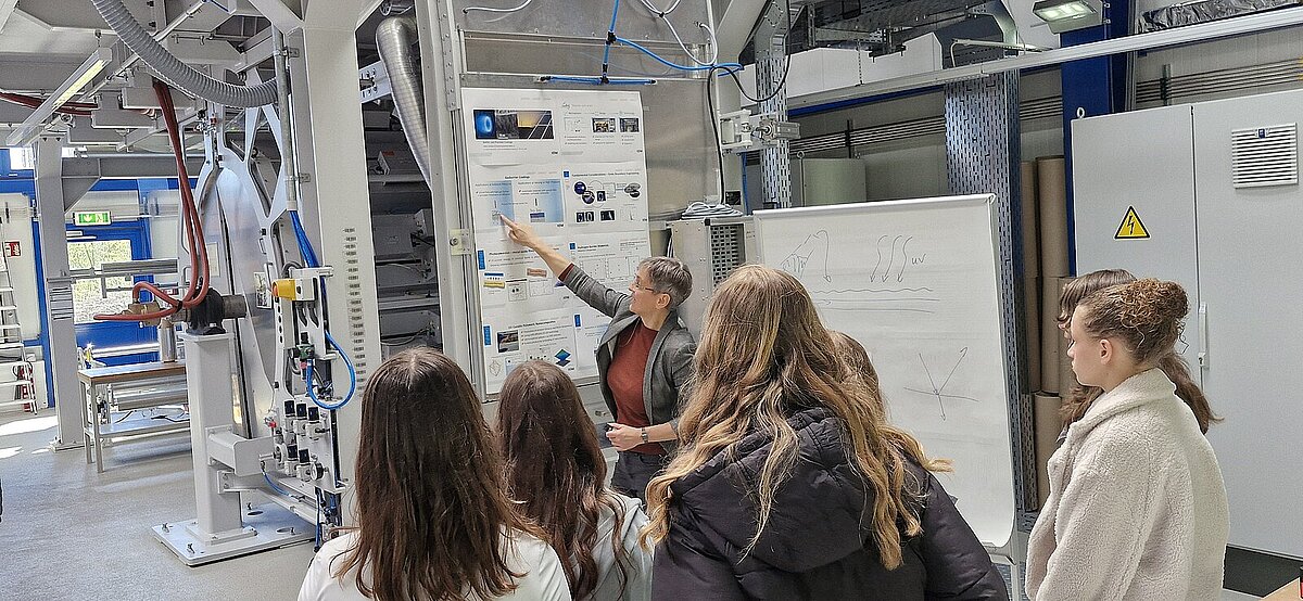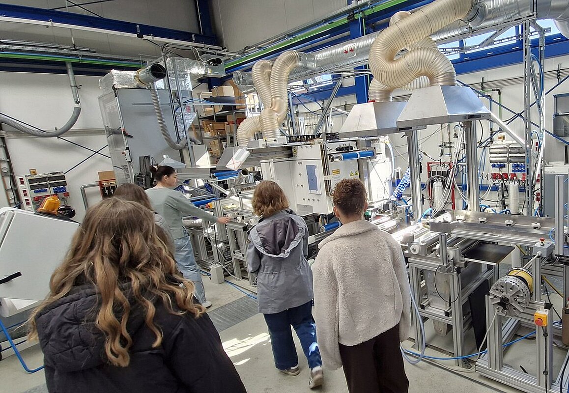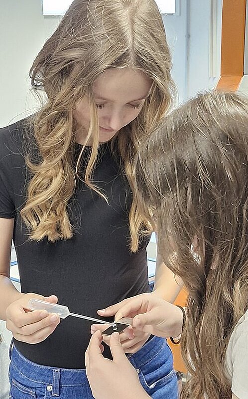 Nach einer kurzen Vorstellung des Instituts ging es direkt los mit einer Tour durch das IOM. Auf dem Programm standen viele abwechslungsreiche Stationen, darunter ein Besuch im Rheologielabor. Dort erfuhren die Teilnehmerinnen unter anderem, warum sich Flüssigkeiten unterschiedlich verhalten und was sich hinter Begriffen wie Viskosität oder Benetzbarkeit verbirgt.