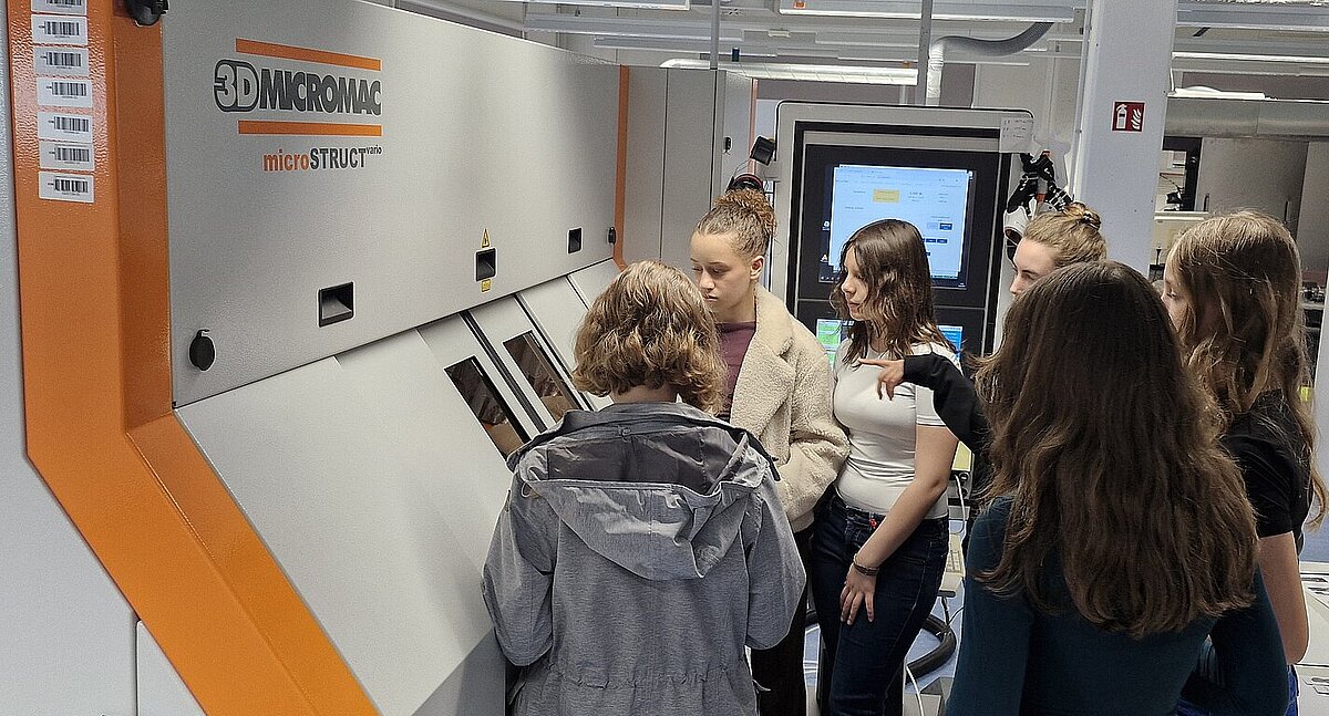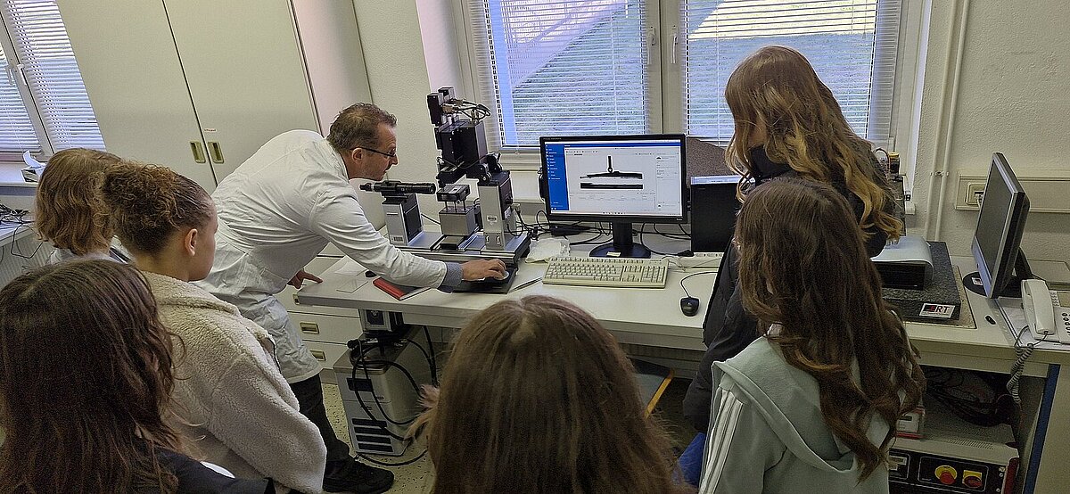 Natürlich durften auch ein Blick ins Lasertechnikum und ein Besuch im Bereich Mikroskopie nicht fehlen. Hier konnten die Schülerinnen das Lasern aus nächster Nähe erleben und sogar das faszinierende Facettenauge einer Fliege bestaunen.
