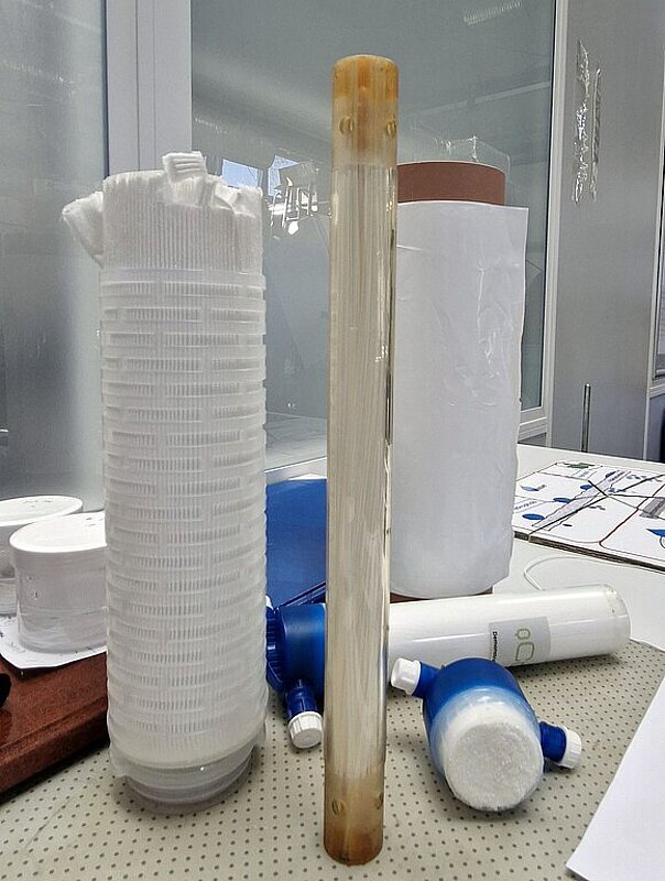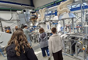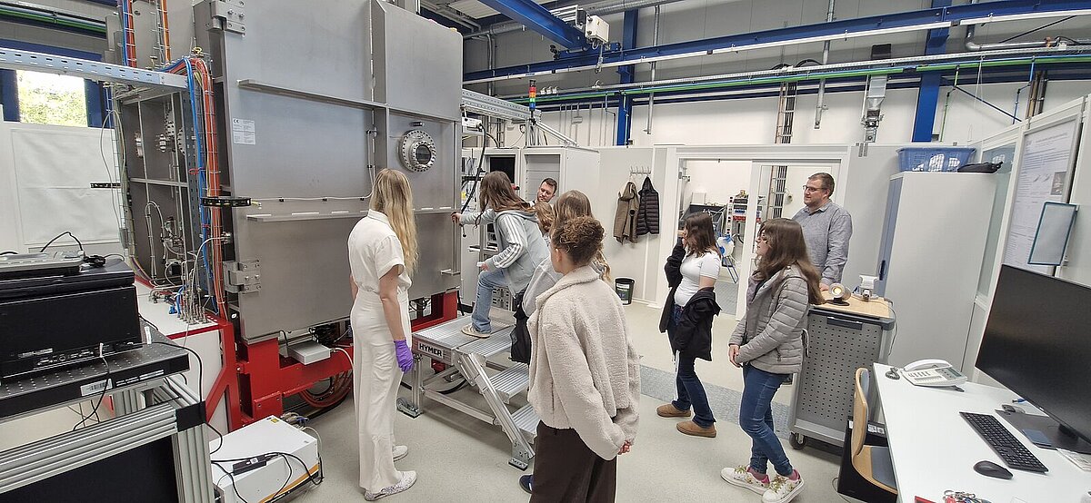 Anschließend besuchten wir das Applikationszentrum, wo verschiedene Pilotanlagen präsentiert wurden, darunter solche zur Membranmodifizierung und Folienbeschichtung sowie zur Strukturierung von Oberflächen mit Ionenstrahlen.