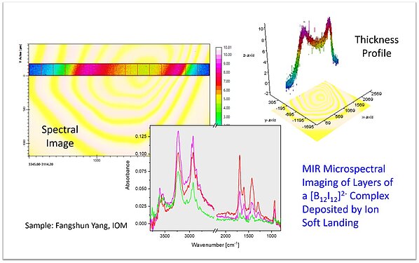 Spectral imaging methods constitute an independent key research topic of the analytics group. Depending on the specific experimental approach, such state-of-the-art methods enable the monitoring of the spatial distribution of chemical and physical parameters across the surface of samples on length scales from micrometers to macroscopic scales. Microspectroscopic imaging techniques are based on mid-infrared (MIR) or Raman microscopy. In combination with a focal plane array (FPA) detector MIR microscopy allows space-resolved measurements up to the optical resolution limit. Investigations with this method at IOM are focused e.g. on microfluidics or nitrogen centers in electron-beam irradiated diamonds. On the other hand, the use of a NIR camera or a multiplexed NIR spectrometer allows the continuous spectroscopic analysis of large-area or web-type materials up to a width of several meters. Applications of such techniques are mainly settled in industrial process control.