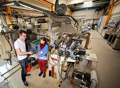 Zum Upscaling der Membranmodifizierung stehen ebenfalls Technikumsanlagen zur kontinuierlichen Modifizierung im Rolle-zu-Rolle-Betrieb inkl. Qualitätskontrolle zur Verfügung.