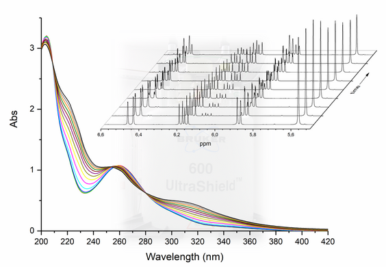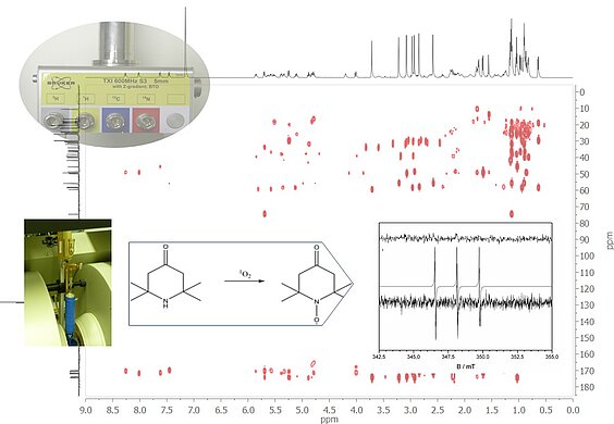 Die hochauflösende NMR-Spektroskopie erlaubt Aussagen zur chemischen Struktur vornehmlich diamagnetischer Verbindungen. Am IOM wird auf dem Gebiet der NMR-Spektroskopie keine eigene Forschung betrieben, vielmehr werden die Aktivitäten der anderen Fachbereiche unterstützt. Am Institut haben wir ein 600 MHz-NMR-Spektrometer mit einem Breitband-Probenkopf. Zusätzlich kann ein C,H,N-Triple-Probenkopf eingesetzt werden. Routinemäßig werden neben 1H-, 13C sowie 2D- auch 29Si, 31P und 51V-NMR-Experimente durchgeführt. Zur Charakterisierung von paramagnetischen Spezies wird die EPR-Spektroskopie eingesetzt. Am Institut verfügen wir über ein X-Band-EPR-Spektrometer. Die Proben können auf minimal 77 K abgekühlt werden. Das Probenspektrum reicht von paramagnetischen Lanthanoid-Komplexen über radikalische Polymerfragmente bis zu reaktiven Sauerstoffspezies, die mittels Spin-Traps der EPR-Spektroskopie zugänglich gemacht werden können.