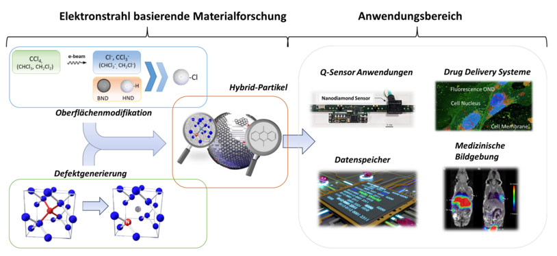 - strahleninduzierte Erzeugung von Defektzentren in Nanopartikel und Festkörpern, insbesondere NV-Zentren (Stickstoff-Fehlstellen-Zentren) in Diamanten.